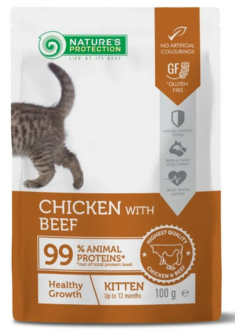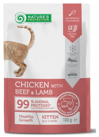 Nature's Protection Healthy Growth Kitten (Курица, говядина, ягненок) – это полнорационные высококачественные консервы для котят с курицей, говядиной и ягненком. Это специальный корм, который помогает поддержать здоровое развитие питомца и укрепить иммунную систему.