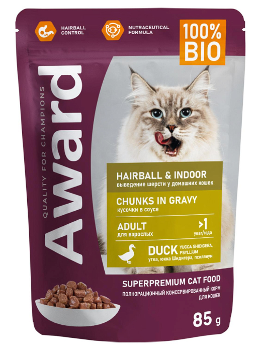 Award Cat Hairball & Indoor (Утка в соусе) — полнорационный консервированный корм для выведения шерсти у взрослых домашних кошек, кусочки в соусе с уткой.
