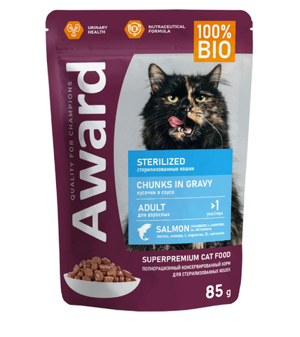 Award Cat Sterilized (Лосось в соусе) — полнорационный консервированный корм «Sterilized» для взрослых стерилизованных кошек, кусочки в соусе с лососем.