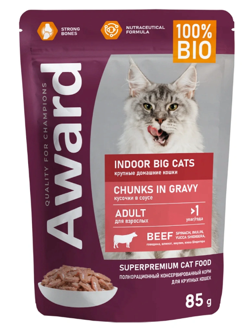 Award Indoor big cats (Говядина в соусе) — полнорационный консервированный корм для взрослых домашних кошек крупных пород, кусочки в соусе с говядиной.