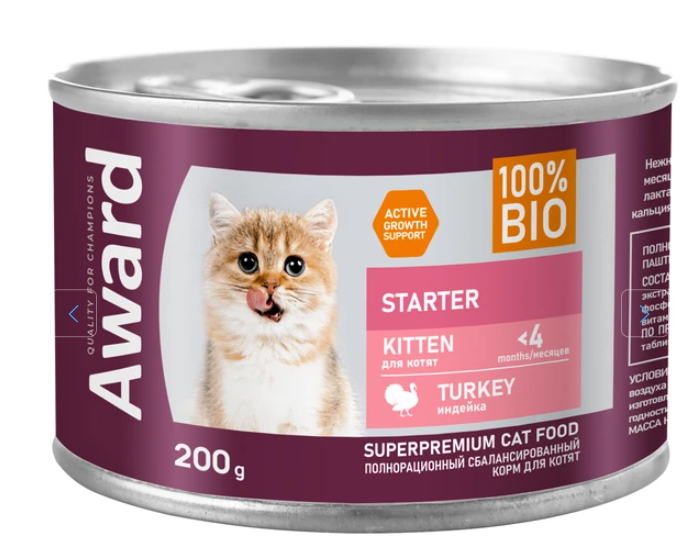 Award Kitten Starter Паштет (Индейка) — влажный корм для котят с начала прикорма до 4 месяцев, беременных и кормящих кошек.