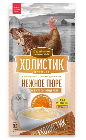 Деревенские лакомства Холистик Нежное пюре из индейки с икрой летучей рыбы — жидкое лакомство для взрослых кошек.