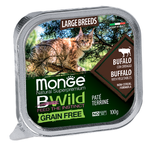 Monge Консервы BWild GF Cat Large Breeds (Буйвол, овощи) — это полноценный сбалансированный рацион из мяса буйвола с овощами для кошек крупных пород от 2 месяцев.