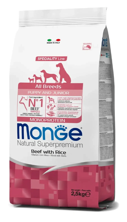 Monge Dog Speciality Puppy & Junior All Breeds (Говядина, рис) – сухой корм из мяса говядины с рисом для щенков всех пород. Сбалансированный полнорационный корм для щенков всех пород в возрасте от 2 до 12 месяцев, который разработан на основе одного источника белка животного происхождения – говядины.
