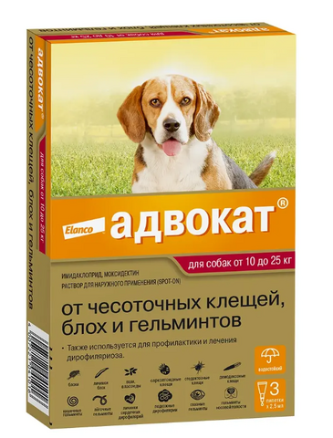 Адвокат – комплексный препарат широкого спектра, действующий на: наружных паразитов – блох, вшей, власоедов и чесоточных клещей, которые могут вызывать зуд у собаки и приводить к таким заболеваниям, как блошиный аллергический дерматит, отодектоз, саркоптоз, демодекоз; внутренних паразитов – круглых гельминтов, паразитирующих в кишечнике, глазах и носовой полости, а также на личинок особо опасных глистов (дирофилярий), взрослые особи которых могут жить в сердце собаки, а также на дирофилярий под кожей. Опасные сердечные паразиты обнаружены в 13 регионах России.